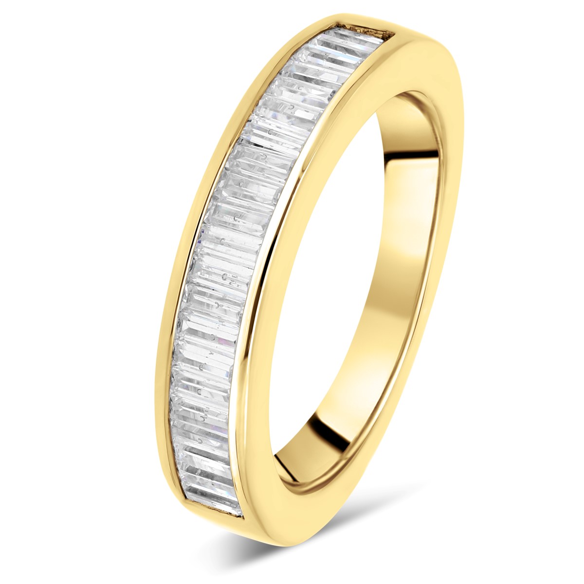 Cette alliance réussit de manière surprenante à marier le classique à la modernité grâce à ses lignes droites et son design épuré. Elle est ornée de diamants taille baguette sertis en semi cercle dans un rail d'or jaune 18 carats. C'est une création exigeante en terme d'éclat et de brillance et seuls des diamants de couleur G et de pureté VS permettront de réveiller son feu !