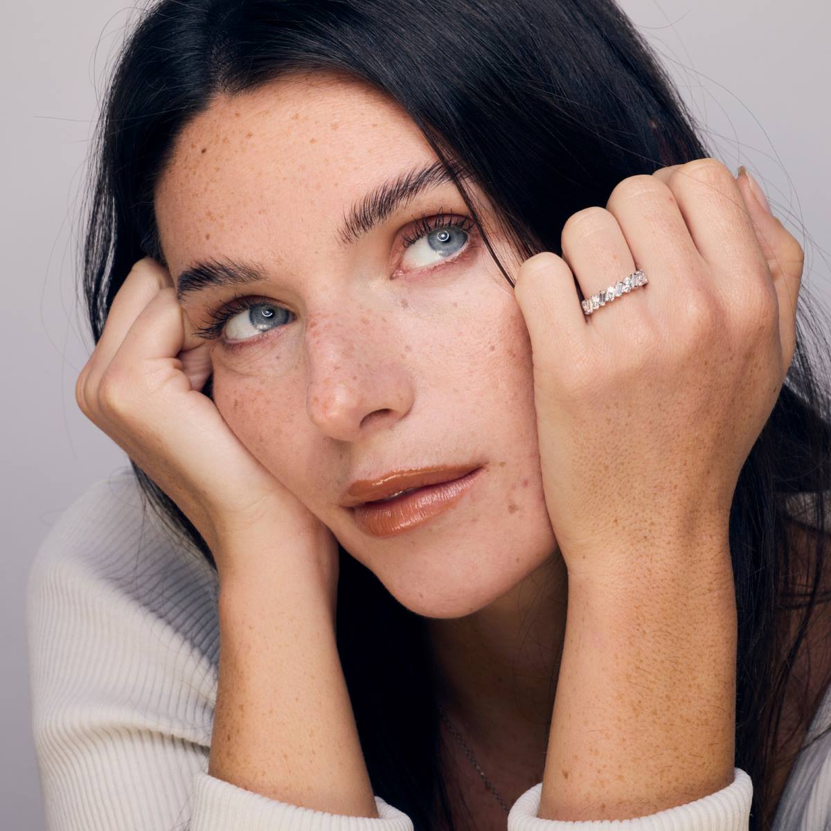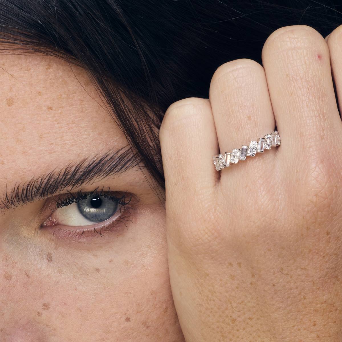 Notre alliance « Sybille » allie modernité et élégance avec un design unique qui alterne des diamants baguettes et ronds. Les diamants baguettes, inclinés avec précision, créent des lignes épurées et angulaires, offrant une brillance discrète et raffinée. Entre chaque baguette, deux petits diamants ronds, sertis verticalement, apportent un éclat plus classique et scintillant, accentuant la délicatesse du design.