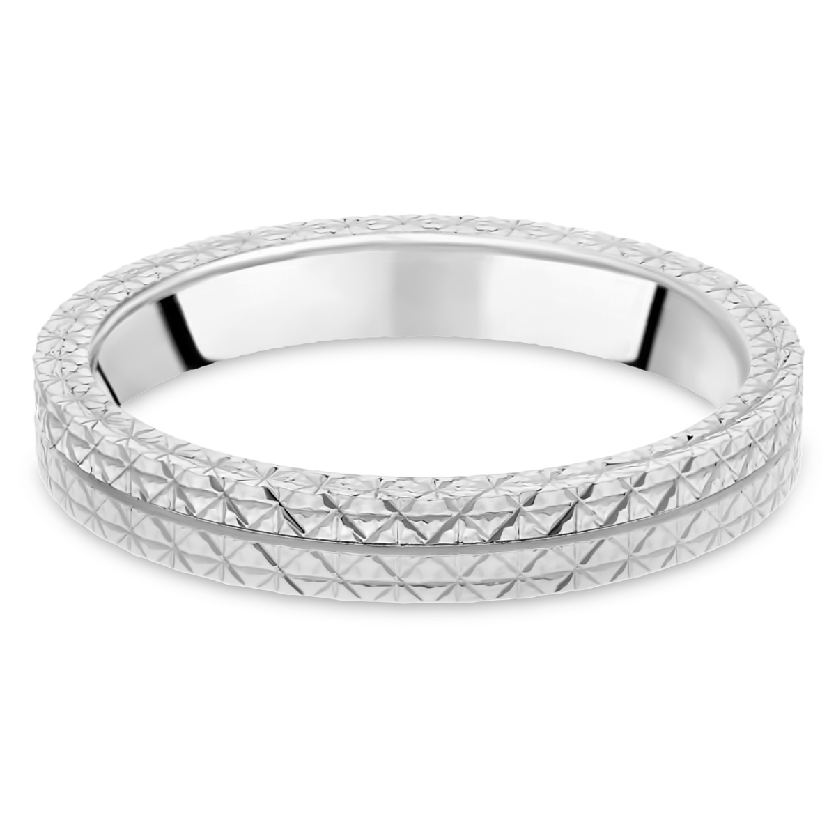 Une alliance de mariage contemporain pour femme, présentant deux rangées ornées d'un motif diamanté. La finition polie lui confère une allure brillante et très féminine. L'alliance peut être confectionnée en or blanc 18 carats ou 9 carats.