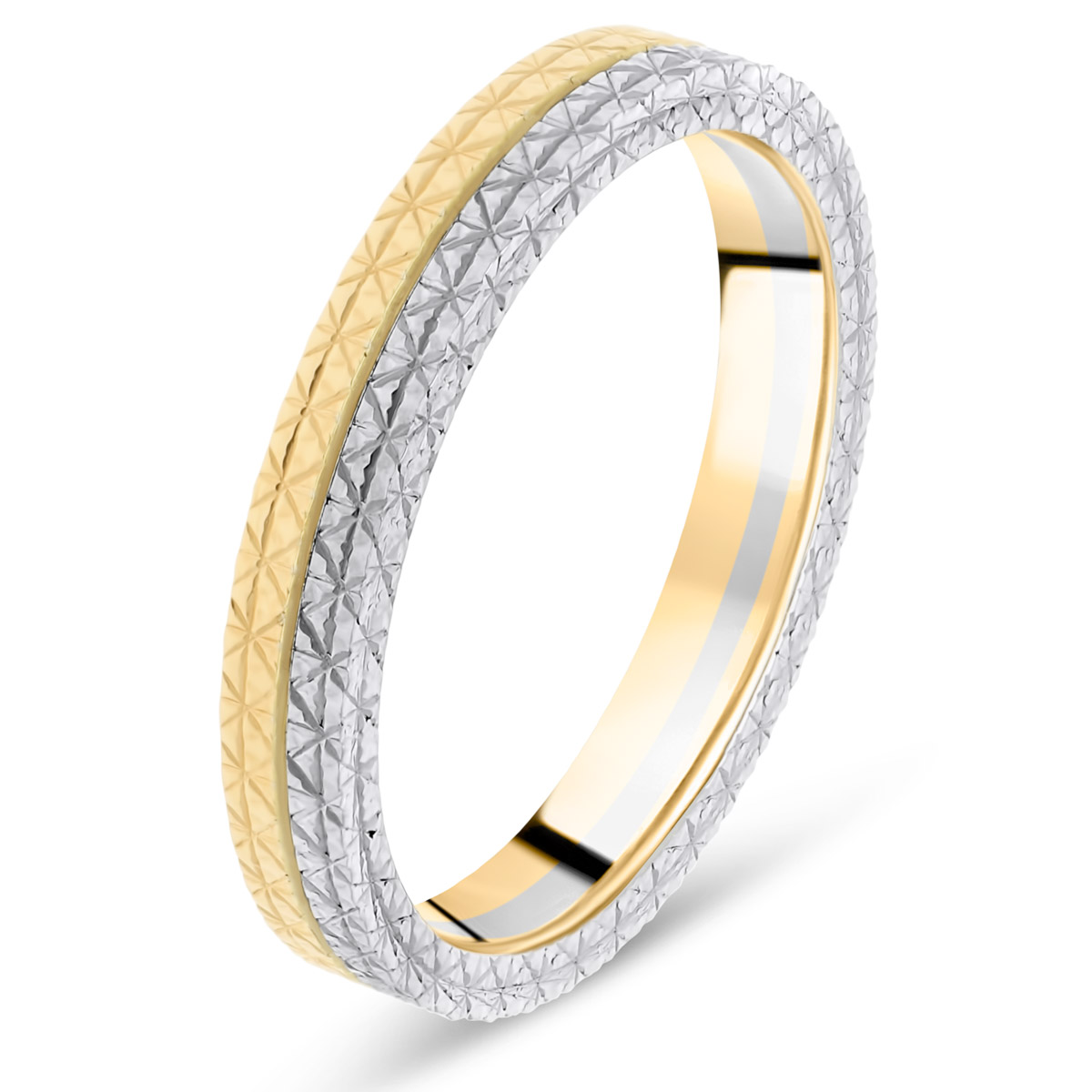 Une alliance de mariage contemporain pour femme, composée de deux anneaux, en platine et en or 18 carats, soudés côte à côte. Les anneaux sont ornés d'un motif diamanté. Les dimensions de la bague: 3 mm la largeur et 1,3 mm l'épaisseur.