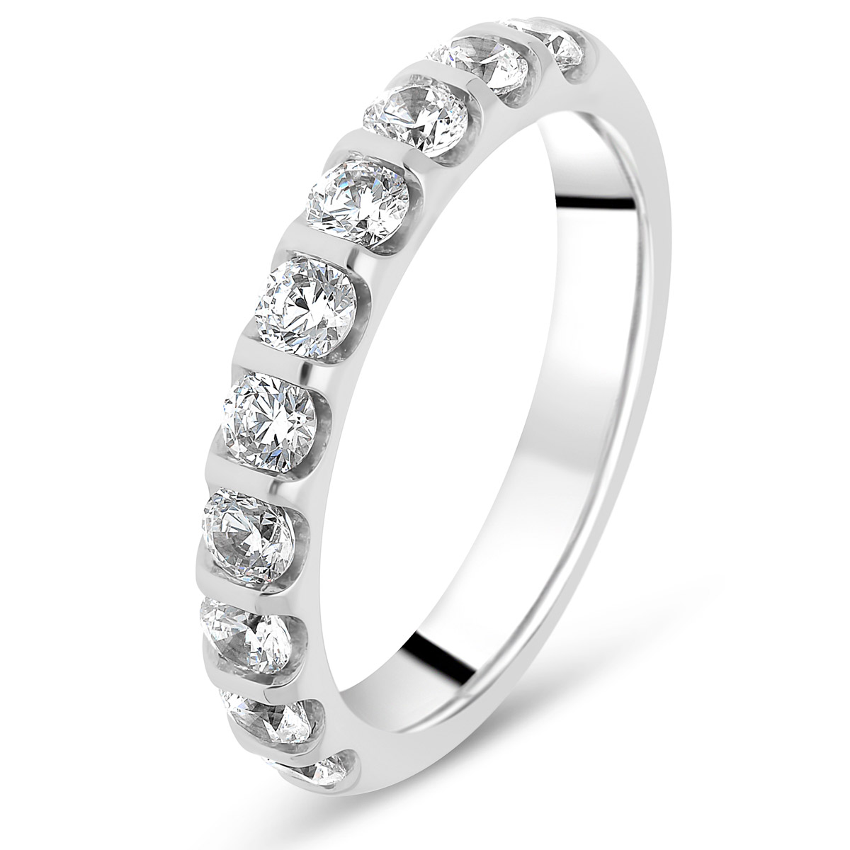 Sublime alliance en or 18 carats pour femme de type demi tour et sertie de diamants. Le sertissage en barrette expose à la lumière chaque côté des gemmes offrant un maximum d'éclat au bijou.