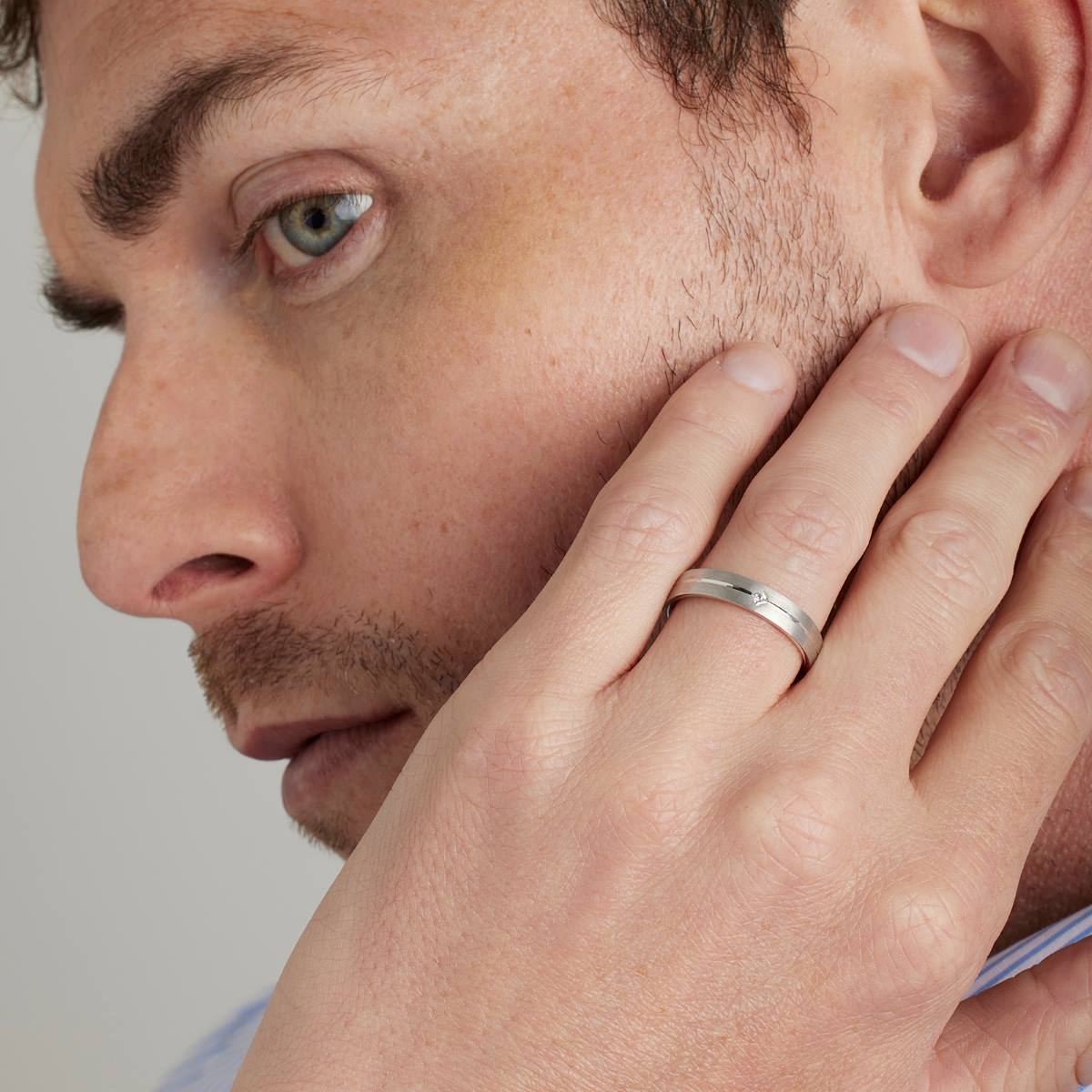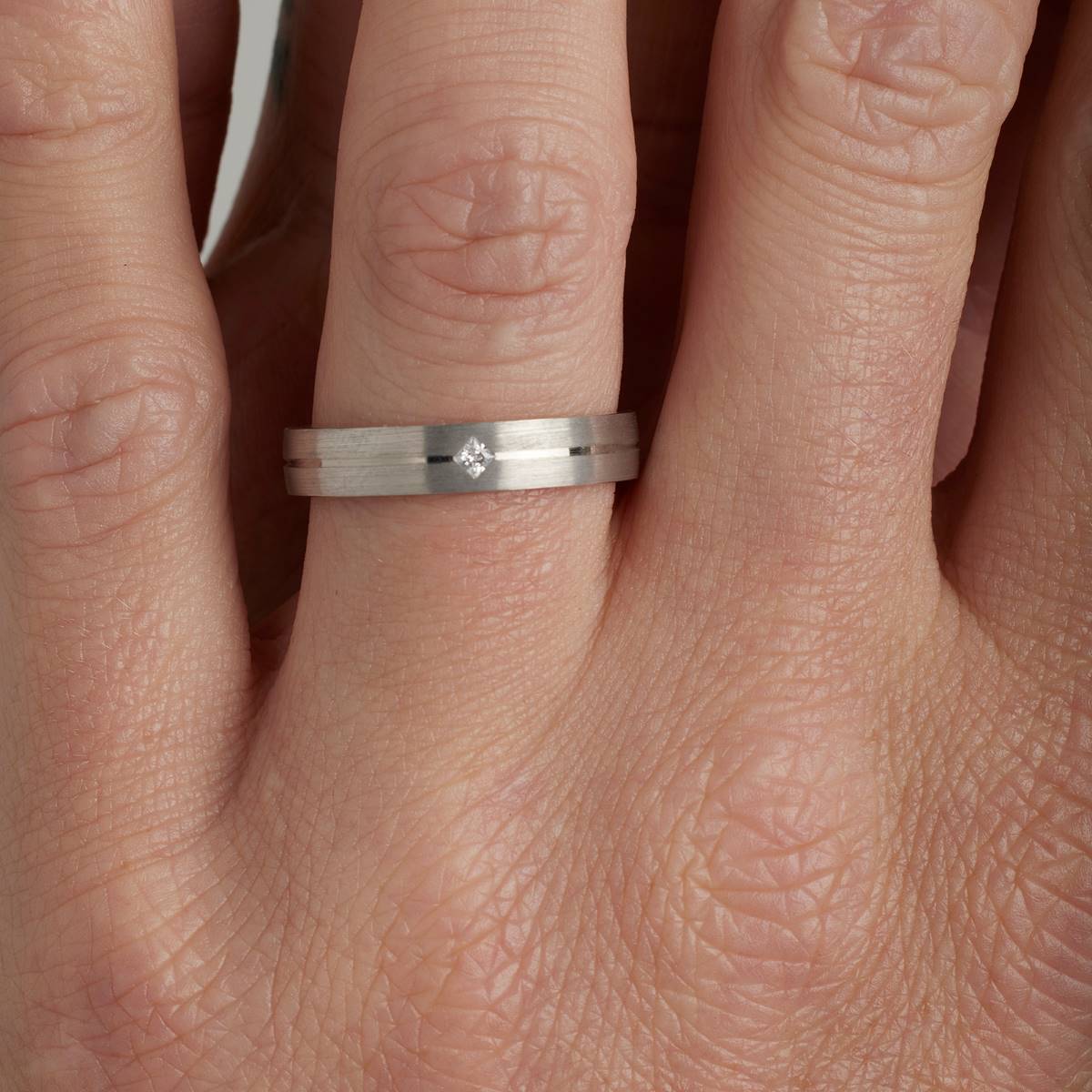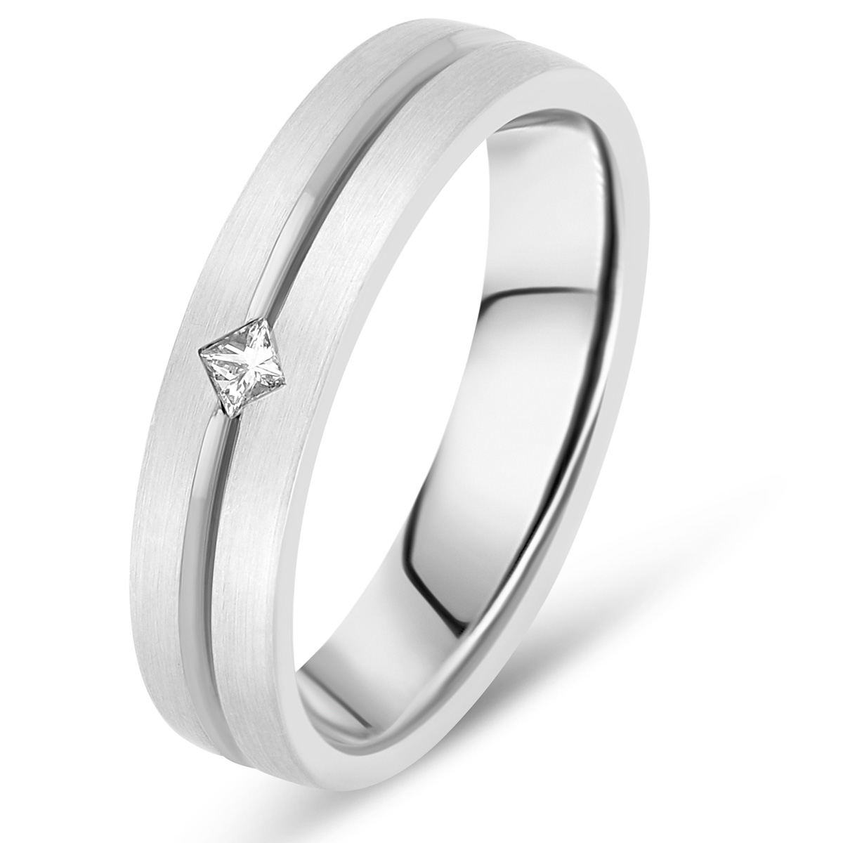 Alliance contemporaine pour homme serti d'un diamant taille princesse de 0.05 carat. Finition extérieure fileté et brossé. Intérieur très bombé pour le confort.