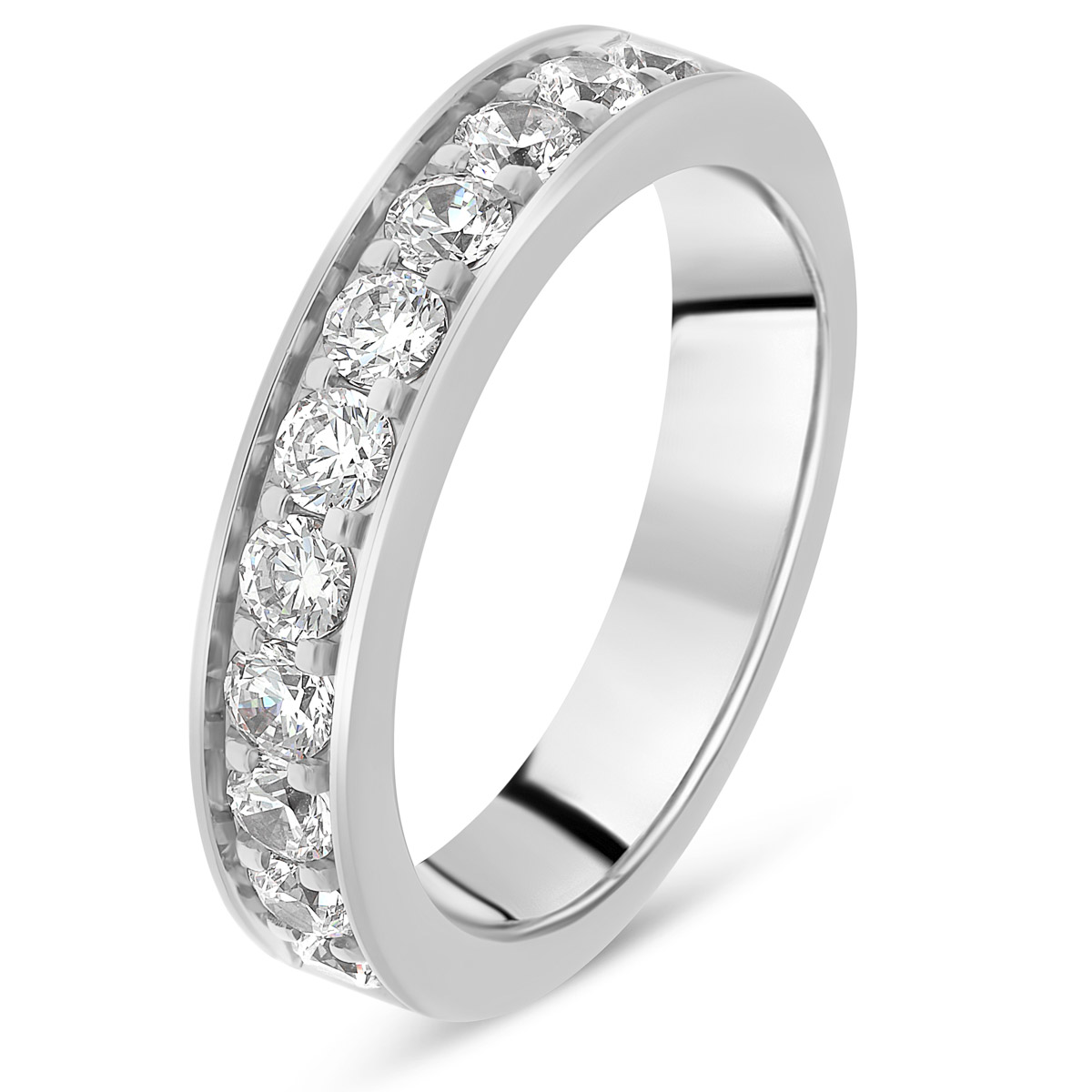 Splendide alliance de mariage pour femme en platine, avec diamants taille brillant de qualité HSI, demi tour serti rail grain. Existe en plusieurs versions de 0.25 à 1 carats. L'intérieur est massif pour permettre la gravure et arrondi pour plus de confort.