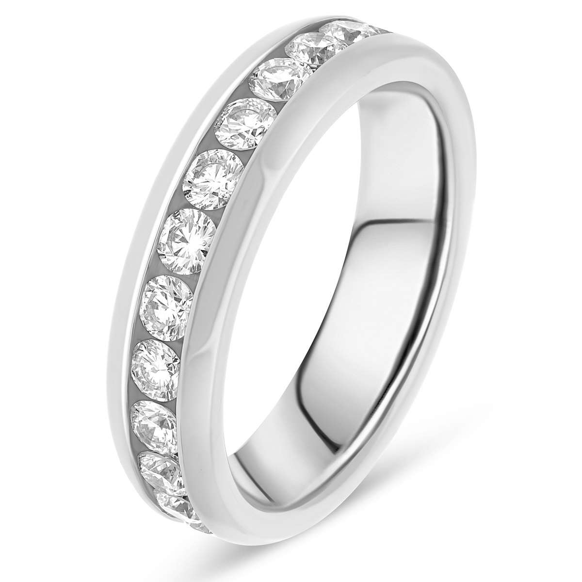 Importante alliance de mariage pour femme en platine, avec diamants taille brillant de qualité HSI, tour complet serti rail large. Existe en plusieurs versions de 0.50 à 2 carats. L'intérieur est massif pour permettre la gravure et arrondi pour plus de confort.