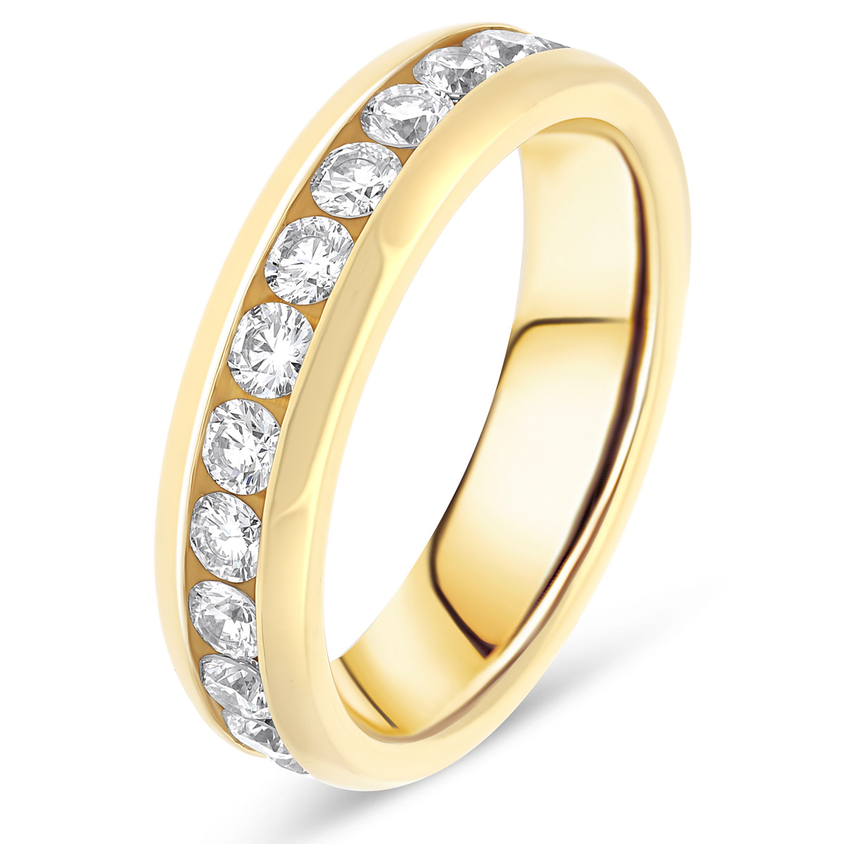 Importante alliance de mariage pour femme en or jaune, avec diamants taille brillant de qualité HSI, tour complet serti rail large. Existe en plusieurs versions de 0.50 à 2 carats. L'intérieur est massif pour permettre la gravure et arrondi pour plus de confort.