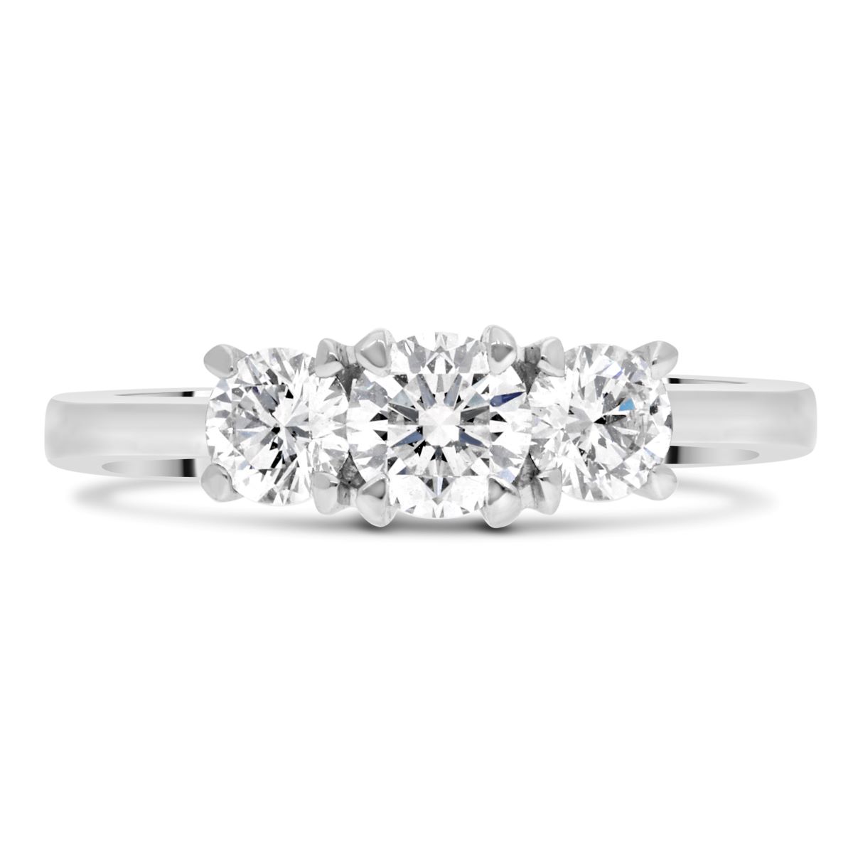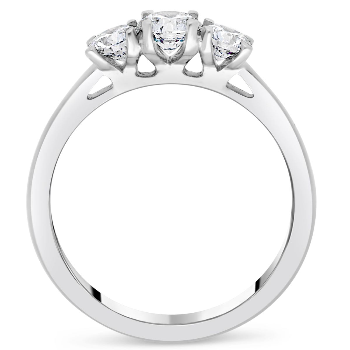 La monture, réalisée en platine, présente une finition polie brillante. L’anneau mesure environ 2,5 mm de largeur à la base et s’affine progressivement jusqu’à 1,5 mm au niveau du chaton, offrant à la fois élégance et confort au porté. Le serti griffe met en valeur les trois diamants tout en garantissant leur maintien.