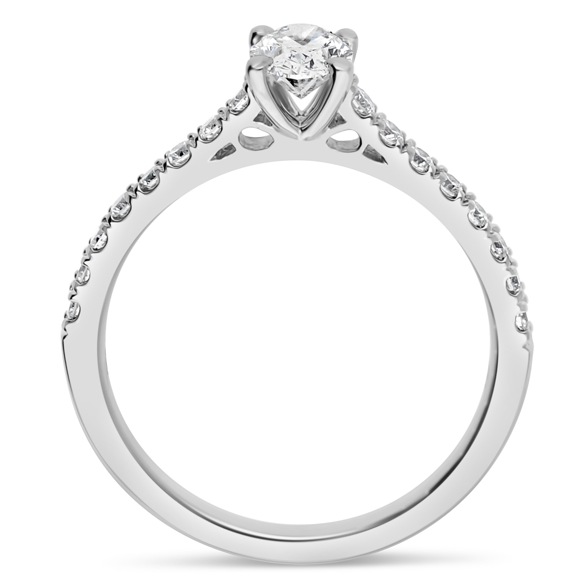 Le diamant central de la bague « Rangiroa » est taillé en ovale qui, grâce à sa forme allongée et ses facettes brillantes, capture la lumière avec une intensité exceptionnelle. L'anneau est serti de petits diamants ronds sur la moitié de son tour, ajoutant une touche de brillance.