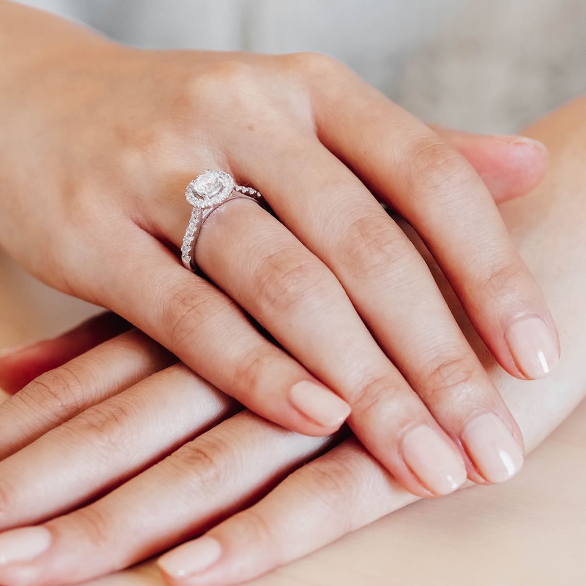 Sur la photo de la bague portée, le modèle Santorin serti d'un diamant de 0,50 carat.