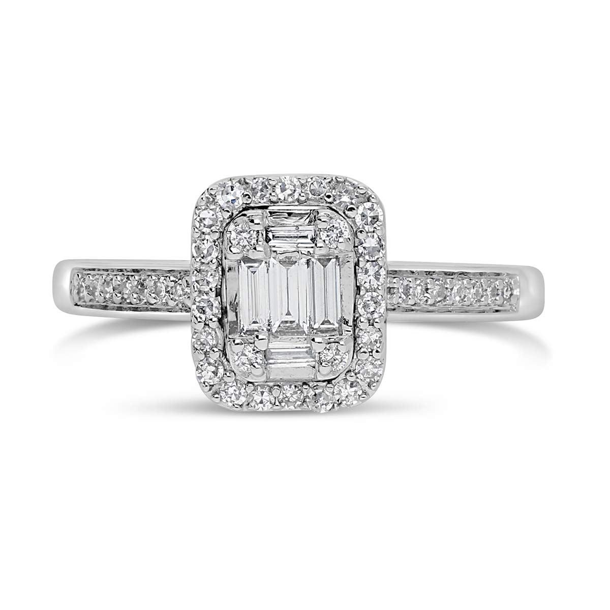 Une bague de fiançailles en diamants naturel HSI et en or 750 millièmes. Son centre de 9,3 mm sur 7,9 mm est composé de diamants taille baguette sertis de manière à créer l' illusion d'une taille émeraude, et entouré de diamants sertis en grains. Le corps de 2,4 mm de largeur est pavé sur sa partie supérieure de diamants sertis en grains. La bague s’emboîte parfaitement avec l'alliance ALD3010W.