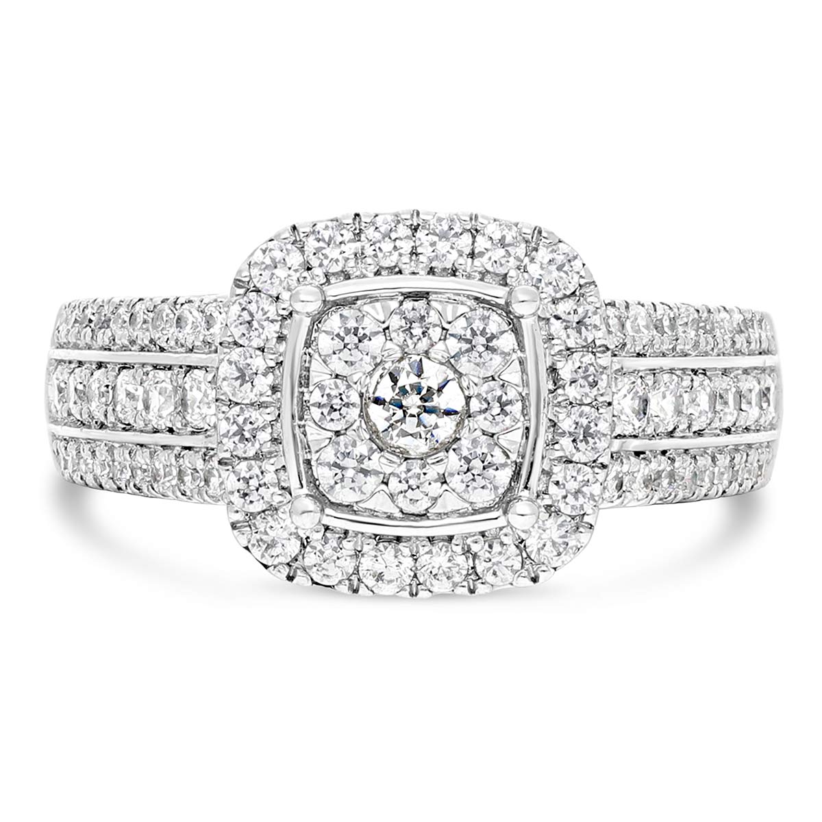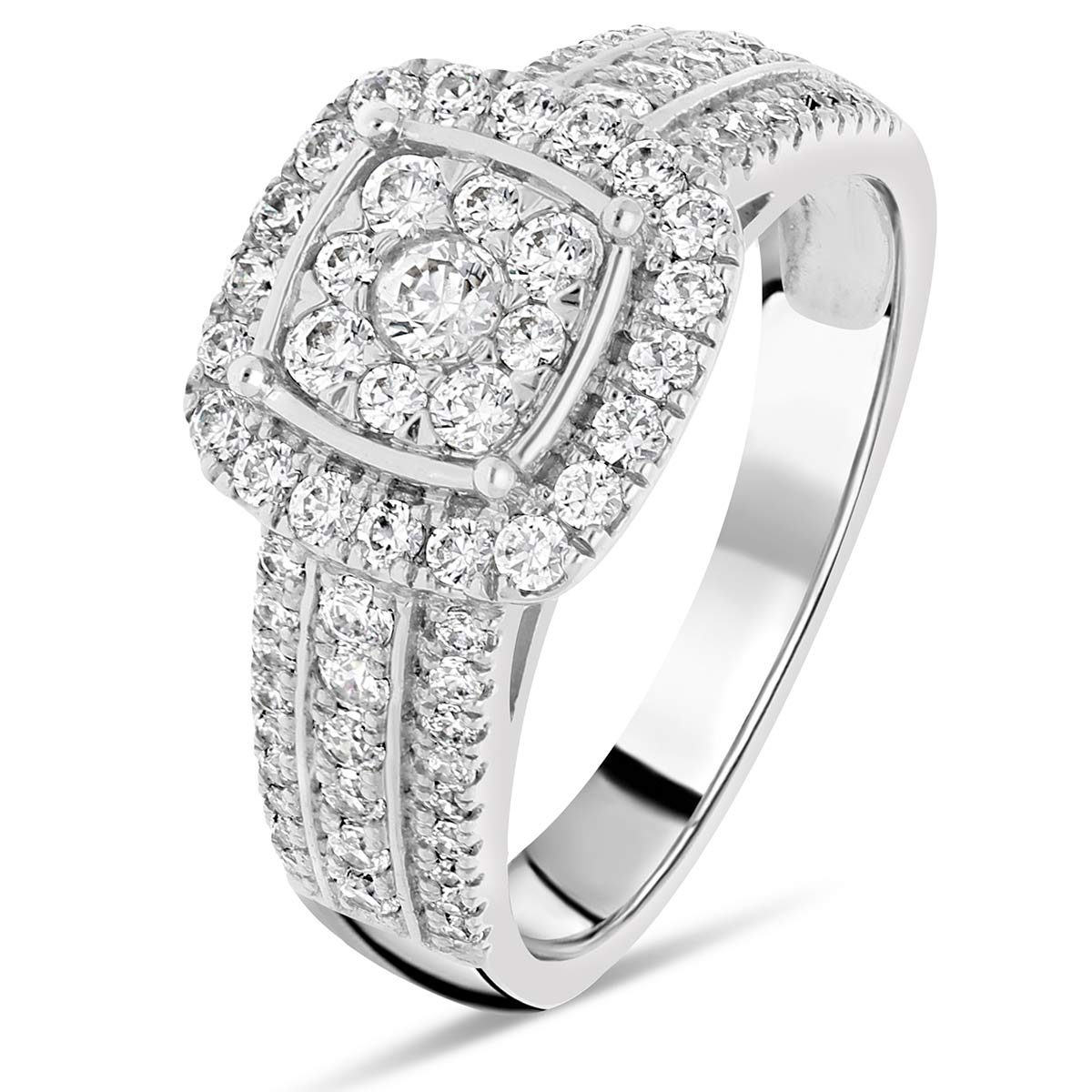 Une bague de fiançailles en or 18 carats, sertie au centre d'un pavage en carré de diamants H SI, la largeur de 10,4 mm. Sa monture est également parée de diamants HSI sertis en rail fin sur le rang central et en mini griffes sur les deux rangs extérieurs.