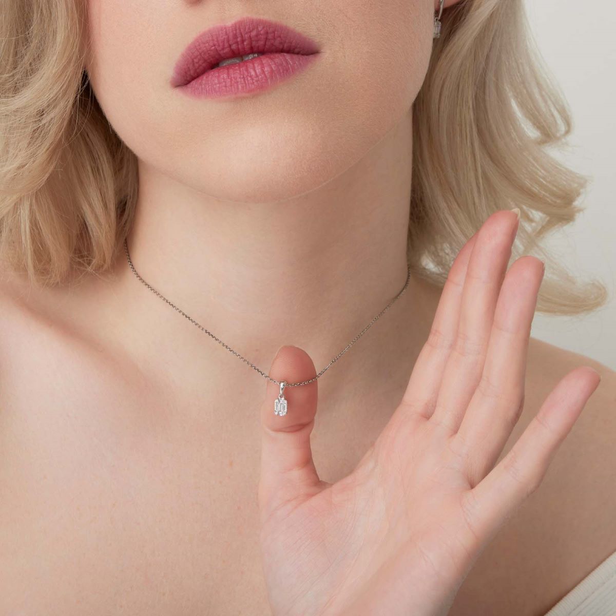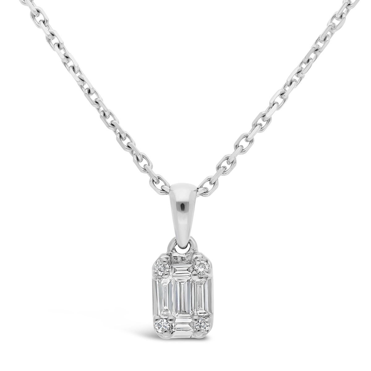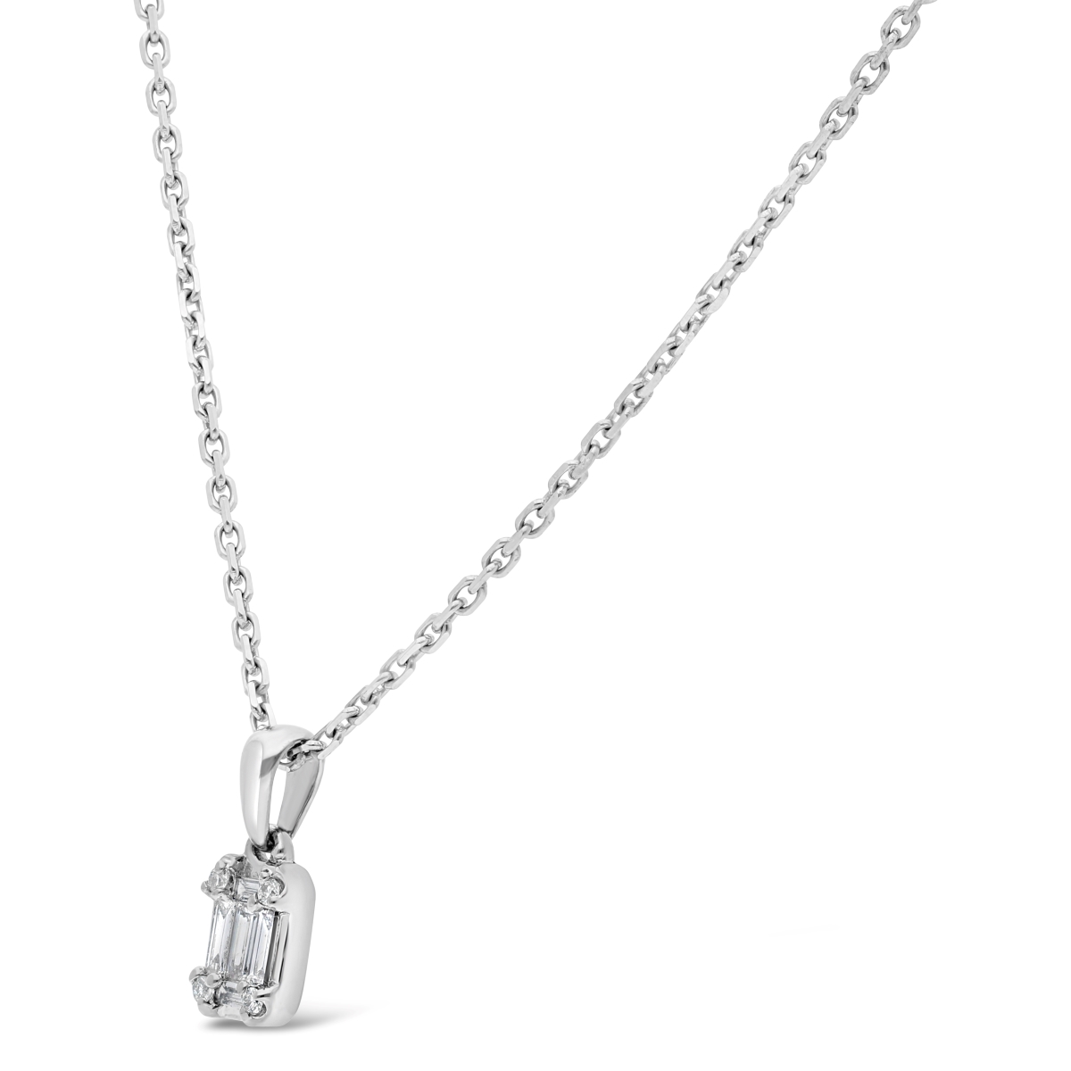Collier serti de diamants taille baguette de manière à créer l'illusion d'une taille émeraude. La monture et la chaîne sont réalisées en or 750 millièmes.
