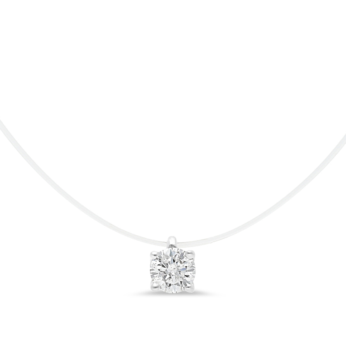 Collier diamant 0,10 HSI serti griffes de 3,0 mm de diamètre, monté en or 750/1000. Le collier est maintenu sur un fil de nylon de 42 cm de longueur.