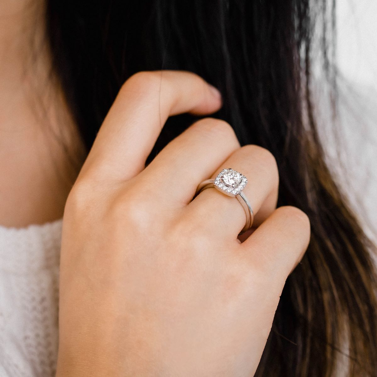 Sur la photo, notre mannequin porte le modèle Kos serti d'un diamant de 0.70 ct.
