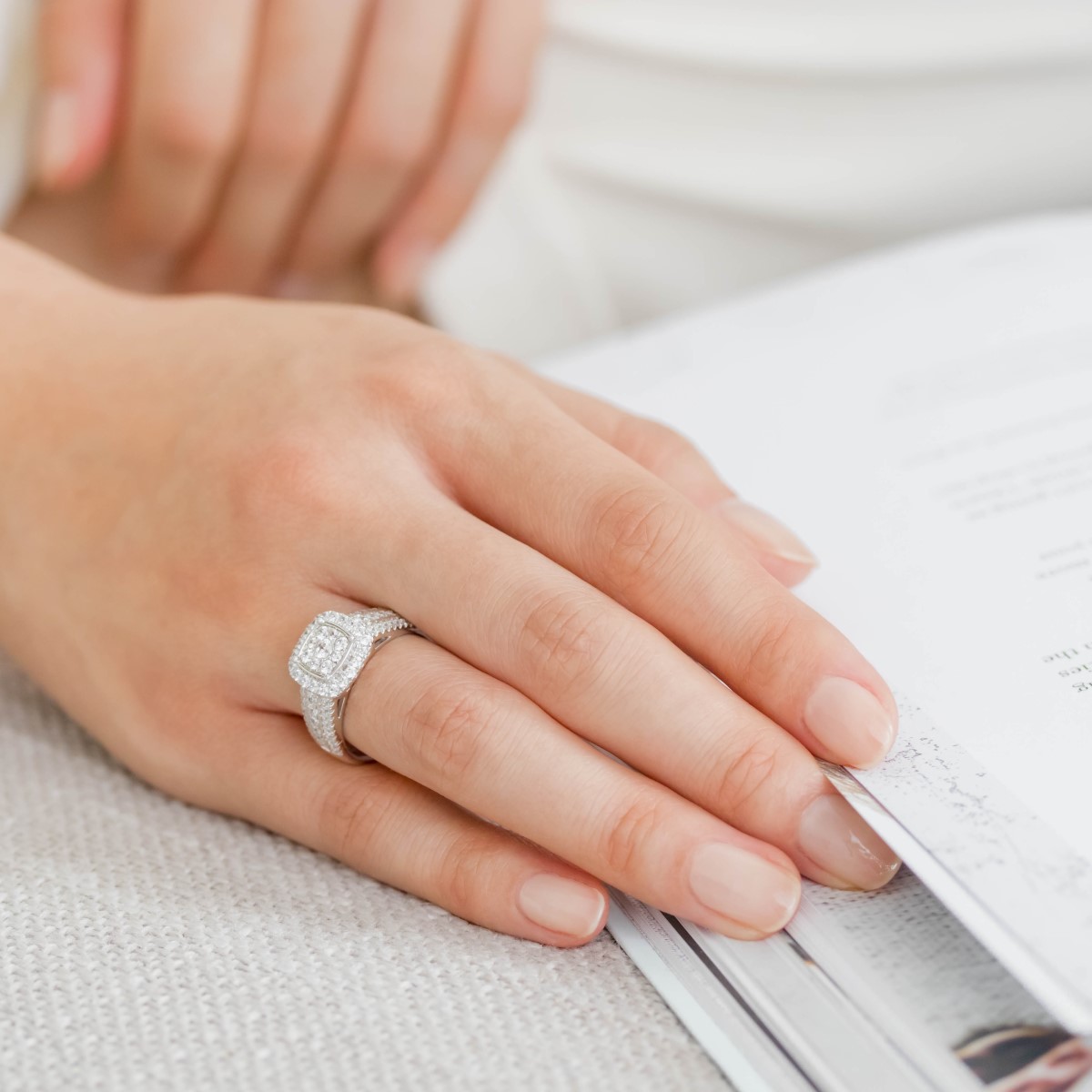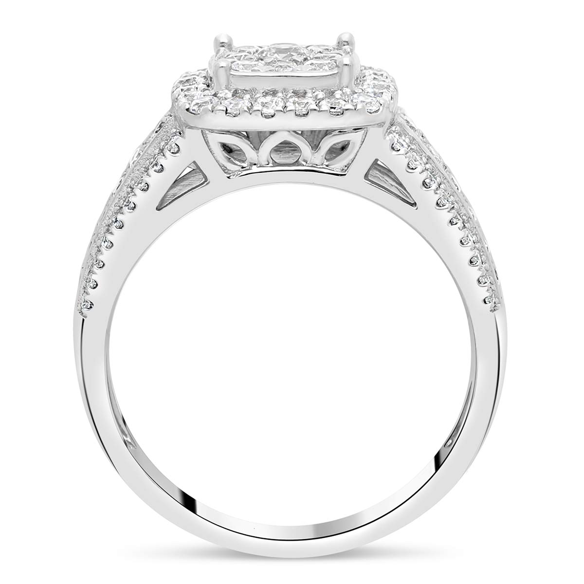 Une bague de fiançailles en or 18 carats, sertie au centre d'un pavage en carré de diamants H SI, la largeur de 10,4 mm. Sa monture est également parée de diamants HSI sertis en rail fin sur le rang central et en mini griffes sur les deux rangs extérieurs.