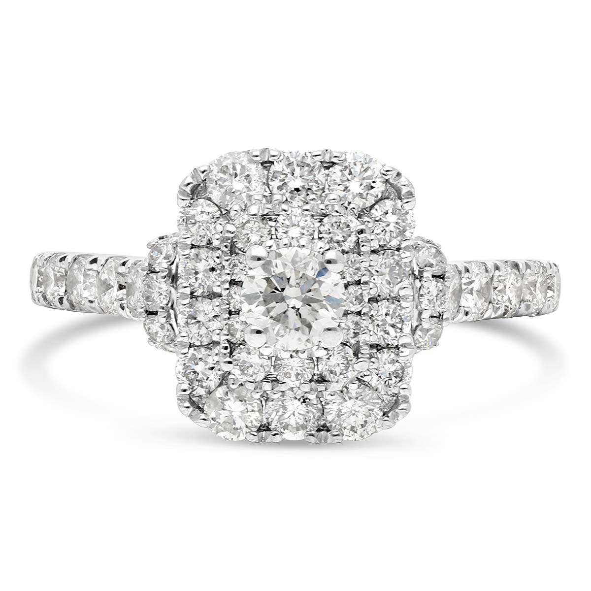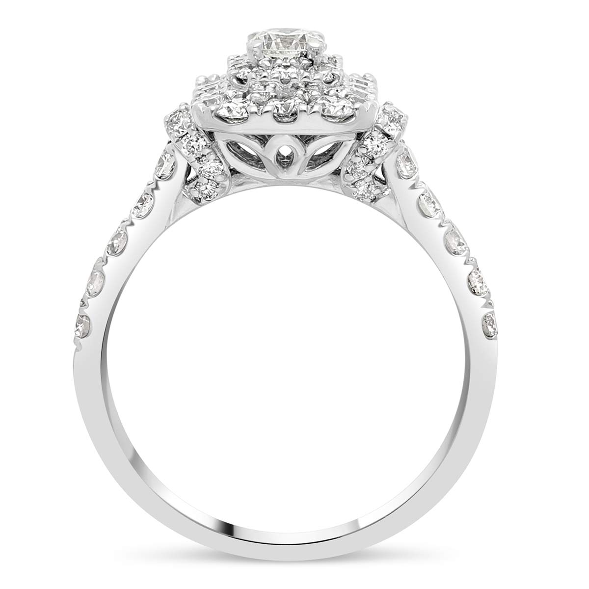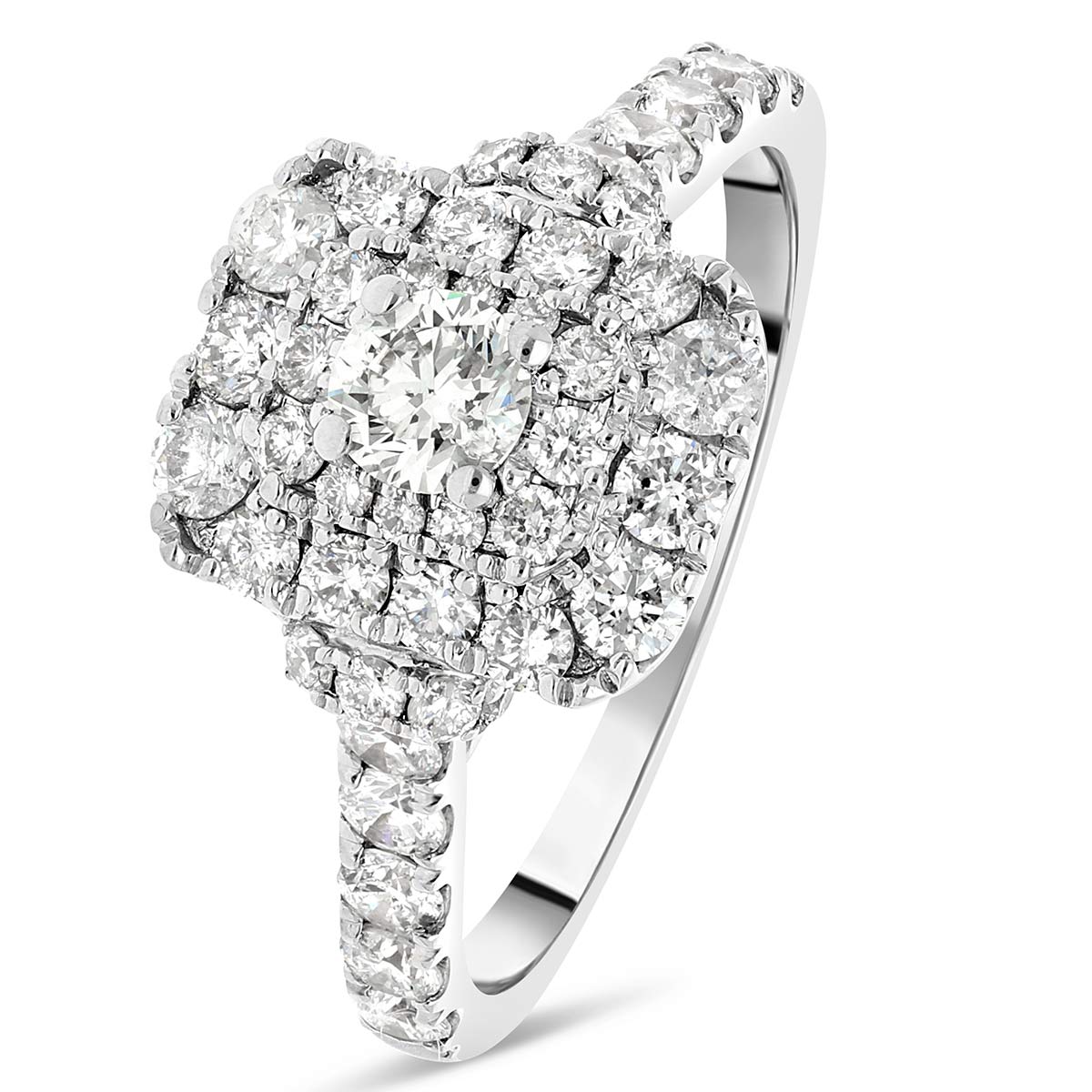Une bague de fiançailles en or 18 cts, ornée au centre d'un diamant de 0,23 ct qui est accompagné d'un pavage de diamants de forme rectangulaire de 0,97 cts de qualité H (couleur) SI (pureté).