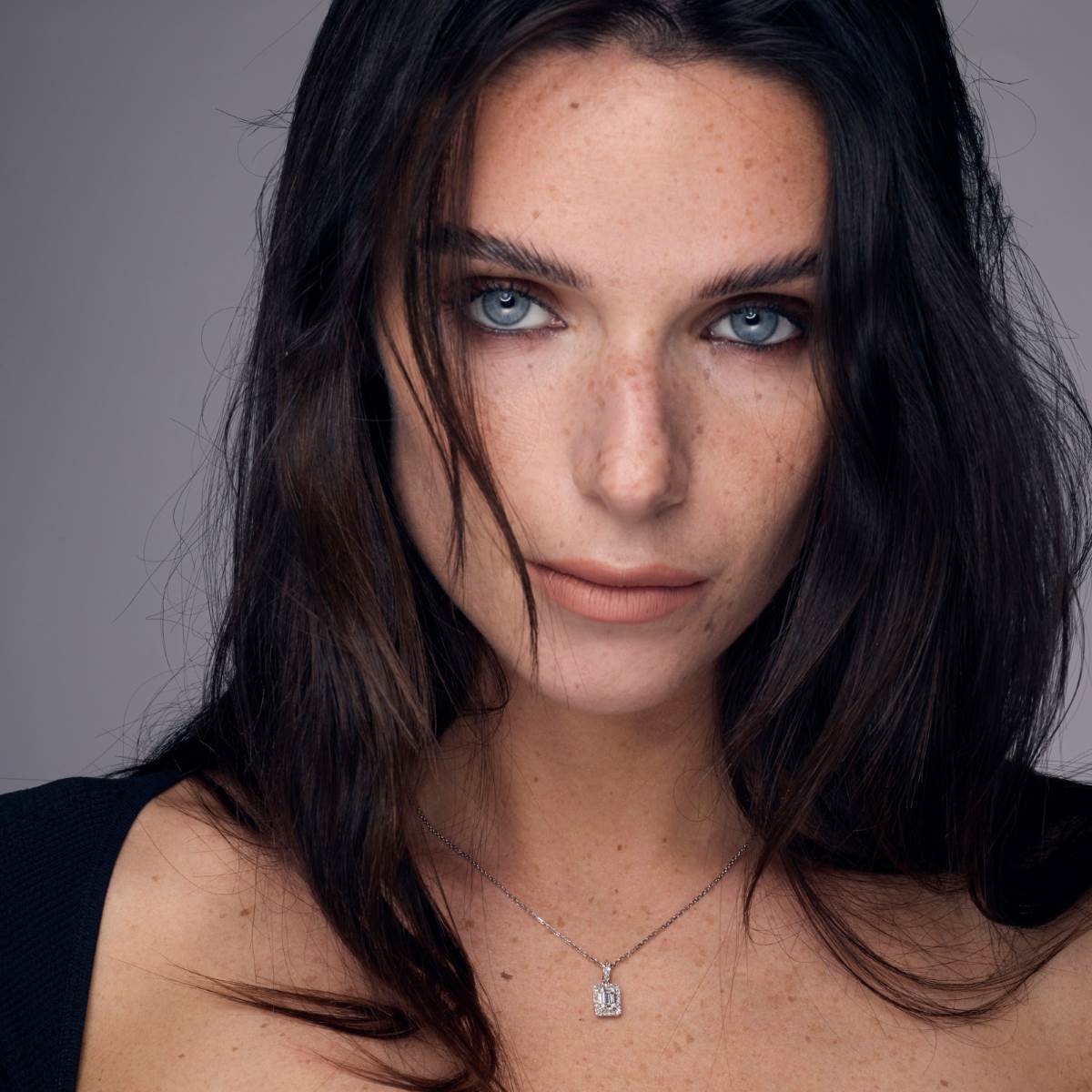 Collier serti de diamants taille baguette de manière à créer l'illusion d'une taille émeraude. La monture et la chaîne sont réalisées en or 750 millièmes.